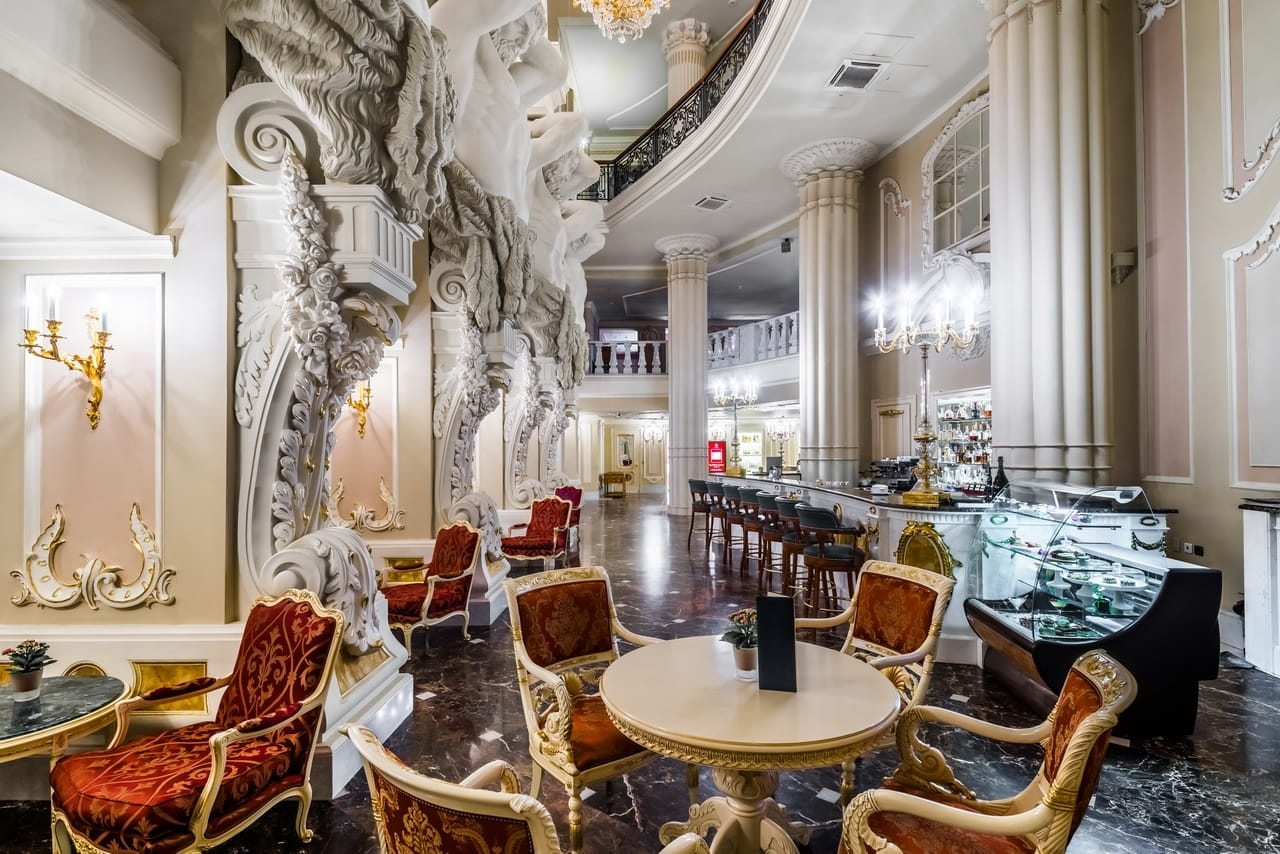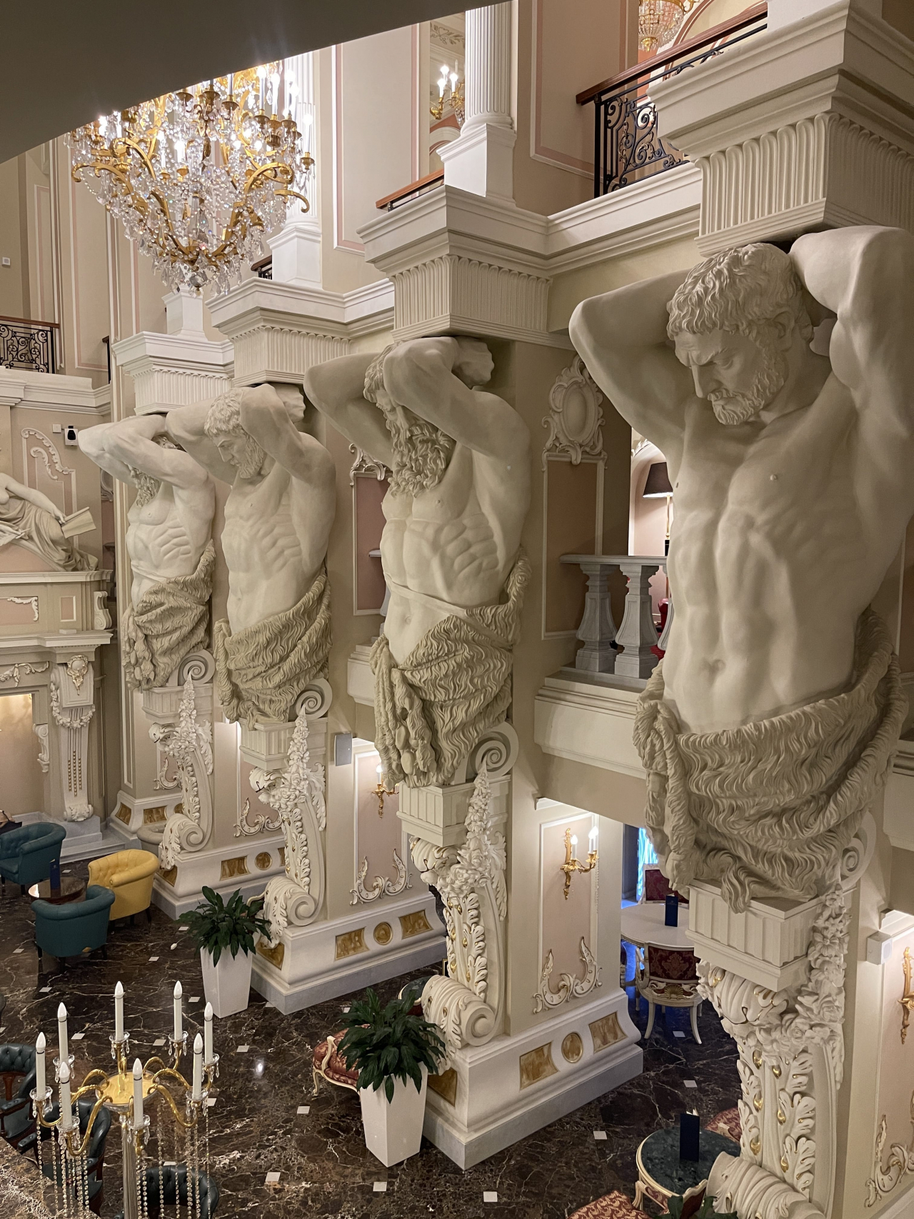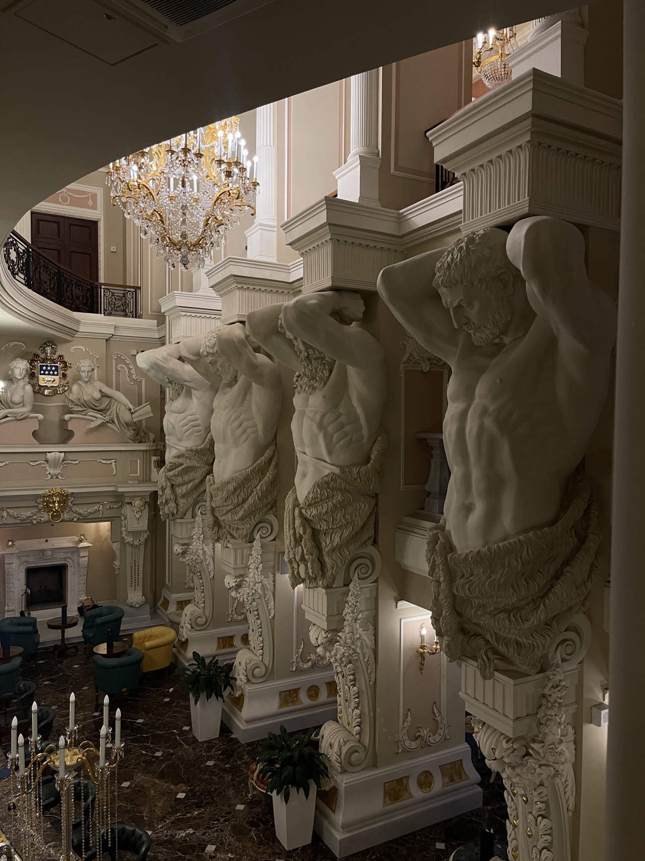 Входя в отель, Вы попадаете в лобби отеля и бар «Атланты», выполненный в стиле необарокко, где четыре фигуры широкоплечих атлантов поддерживают свод.
