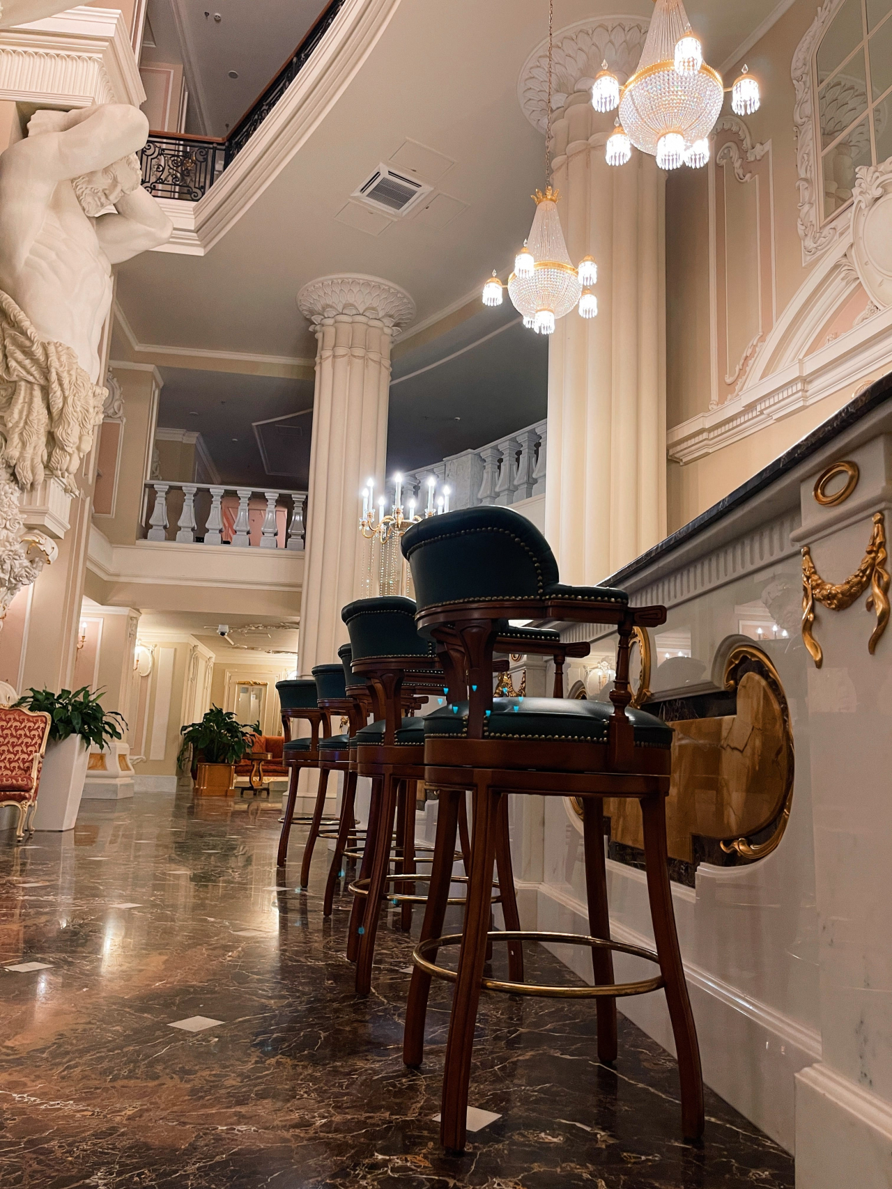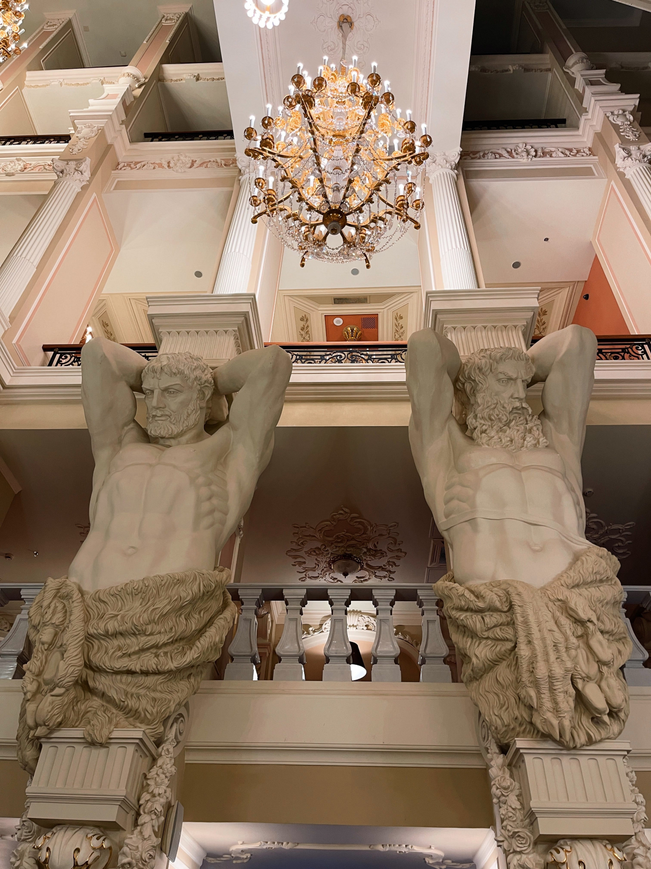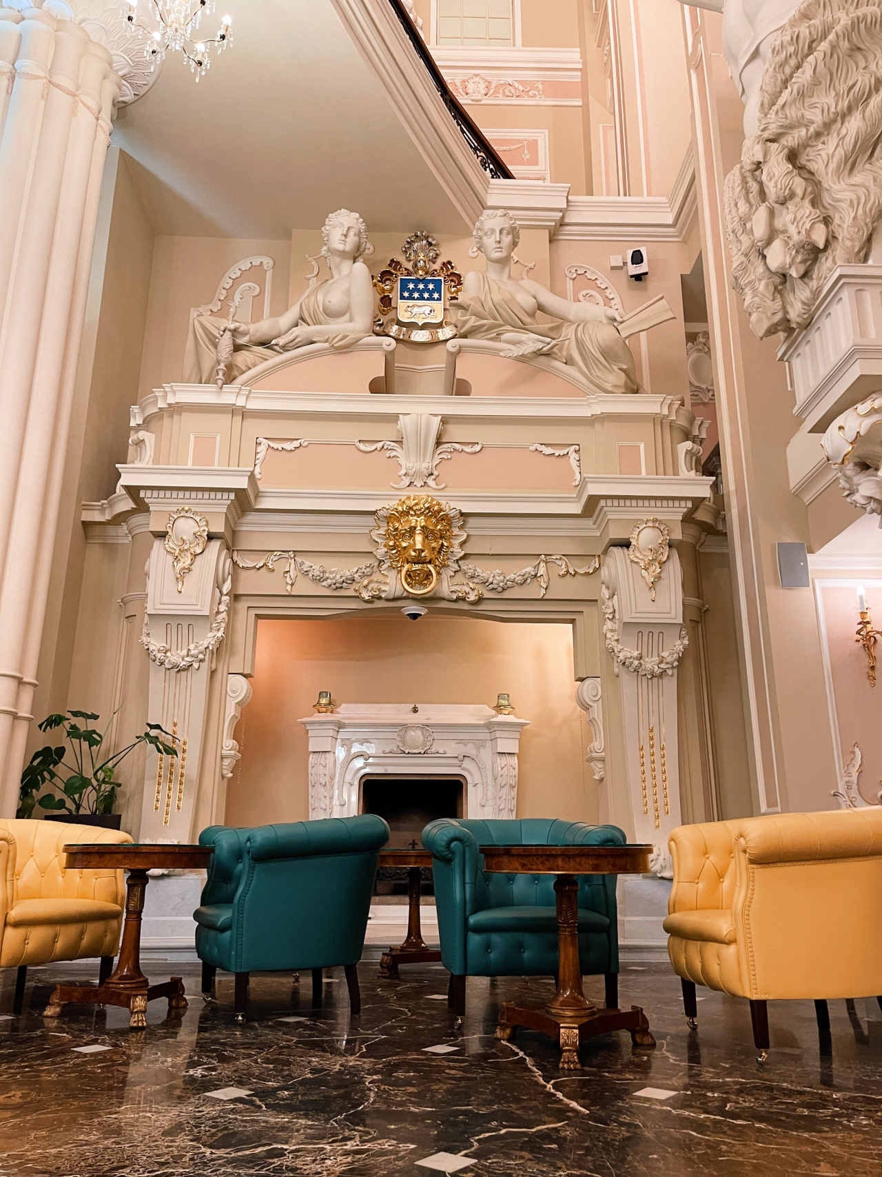 Входя в отель, Вы попадаете в лобби отеля и бар «Атланты», выполненный в стиле необарокко, где четыре фигуры широкоплечих атлантов поддерживают свод.